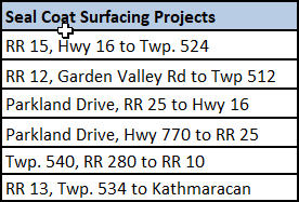 June 26, 2025: Contractor had completed seal coat application for all locations on June 15, 2025. Tack coat applications to start in the week of June 30 with line painting on RR 273 (Golden Spike Road) to follow.