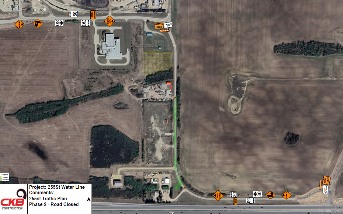 September 26, 2025: 255 St is closed under the Phase 1 road closure (see below). Horizontal directional drilling of the waterline across Hwy 16A is complete and open trench water line installations are ongoing along 255 St.